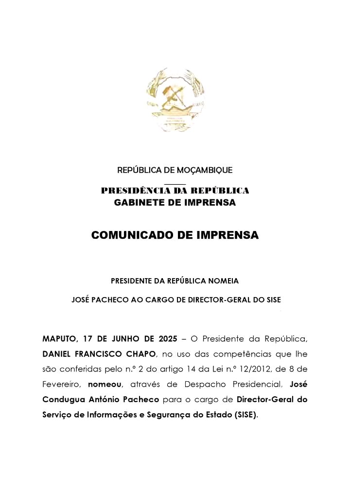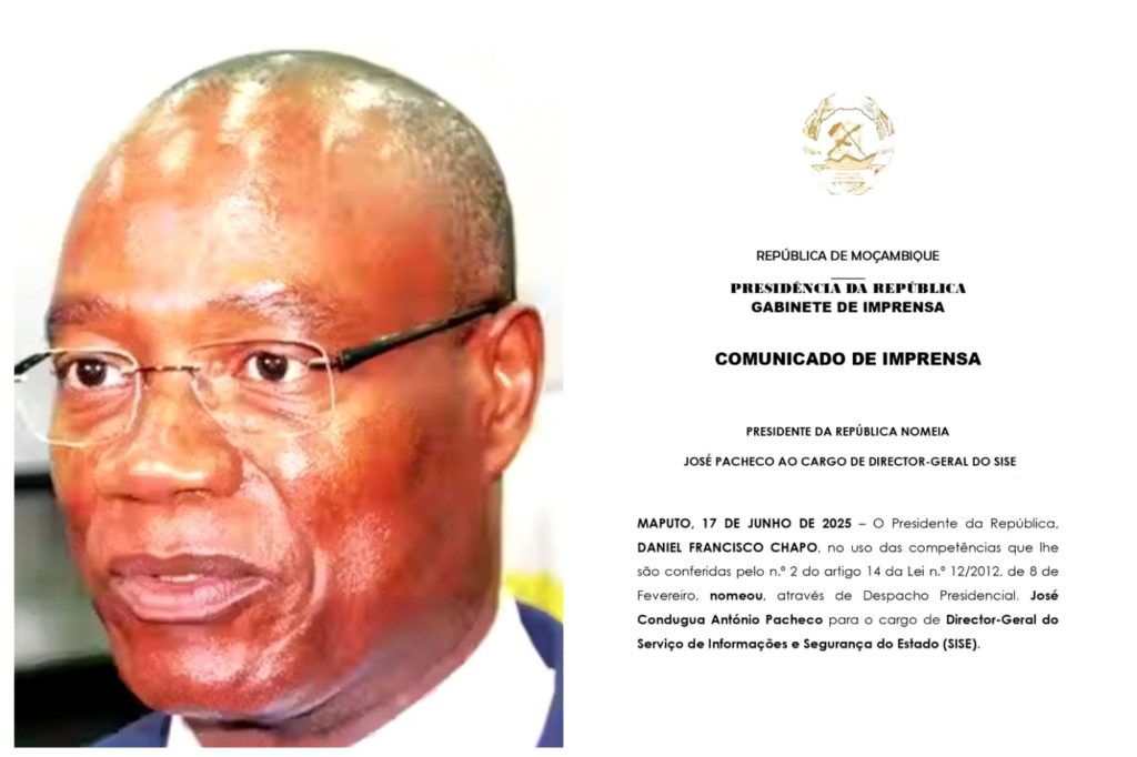 Maputo, 17 de Junho de 2025 – O Presidente da República de Moçambique, Daniel Francisco Chapo, nomeou José Condugua António Pacheco para o cargo de Director-Geral do Serviço de Informações e Segurança do Estado (SISE). A decisão foi formalizada através de um Despacho Presidencial, com base nas competências atribuídas ao chefe de Estado pela Lei n.º 12/2012, de 8 de Fevereiro.