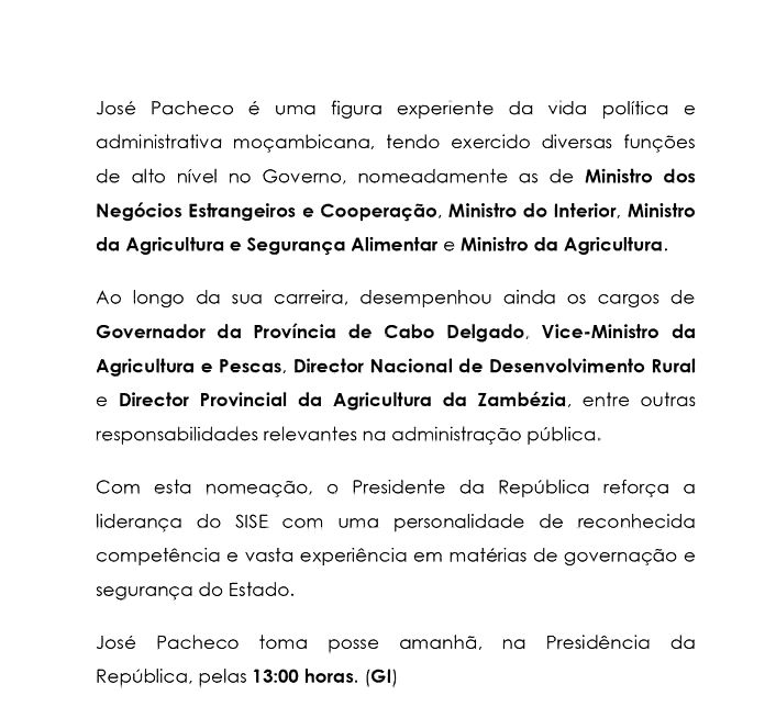 A nomeação reforça a liderança do SISE com um perfil de reconhecida competência e vasta experiência em questões de governação e segurança nacional. Segundo o comunicado da Presidência, José Pacheco tomará posse do cargo amanhã, 18 de Junho, às 13:00 horas, em cerimónia realizada na Presidência da República.