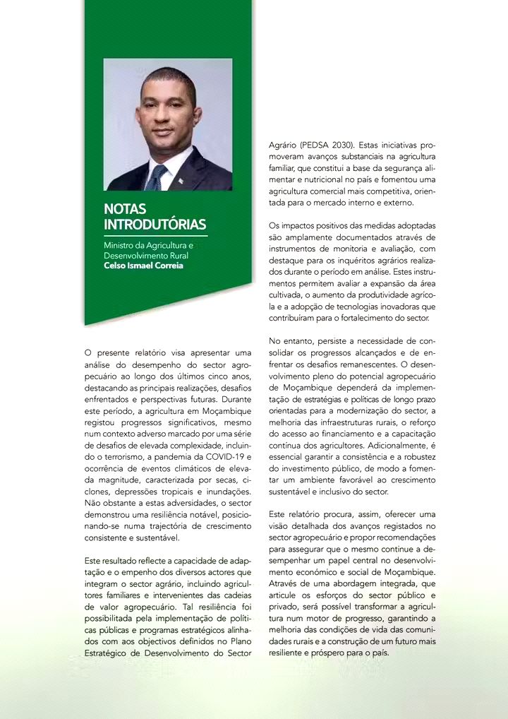 Nas notas introdutórias do documento, Correia destaca “progressos significativos” na agricultura moçambicana, apesar de adversidades como a pandemia da COVID-19, terrorismo e desastres naturais. O ex-ministro elogia ainda a “resiliência notável” do sector e fala em “aumento da produtividade”, “expansão da área cultivada” e “adoção de tecnologias inovadoras”.