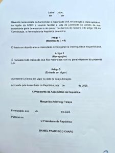 Maputo, 1 de Julho de 2025– O membro do Conselho de Estado, Vendário Antônio Bila Mondlane, submeteu hoje um anteprojeto de lei à Presidência da Assembleia da República que propõe a redução da maioridade civil em Moçambique dos atuais 21 para 18 anos. A iniciativa, dirigida à Presidente do Parlamento, Margarida Adamugy Talapa, surge após consultas à juventude e à comunidade académica, que apontam a legislação vigente como “absurda” e desalinhada dos padrões regionais e globais.