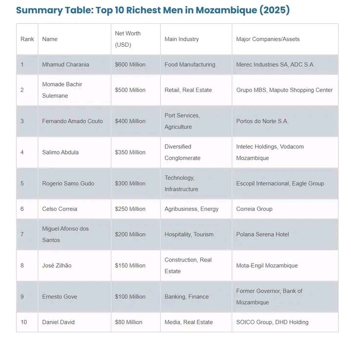 A lista evidencia a força de setores como indústria alimentar, telecomunicações, energia, construção civil, turismo e comunicação social na formação das grandes fortunas moçambicanas, refletindo também a crescente diversificação da economia nacional. Continue lendo em: MozToday News